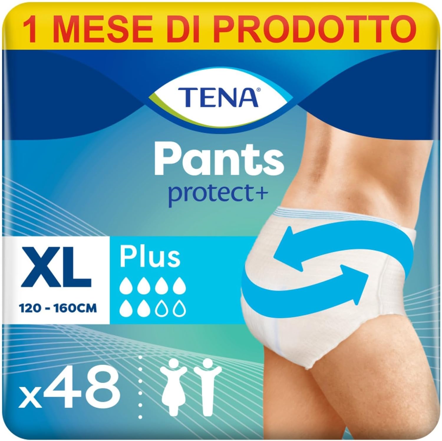 TENA Pants Plus XL Pacco Scorta Mensile: mutandine assorbenti unisex, discrete, elasticizzate e confortevoli per perdite urinarie – 4 confezioni da 12 pezzi